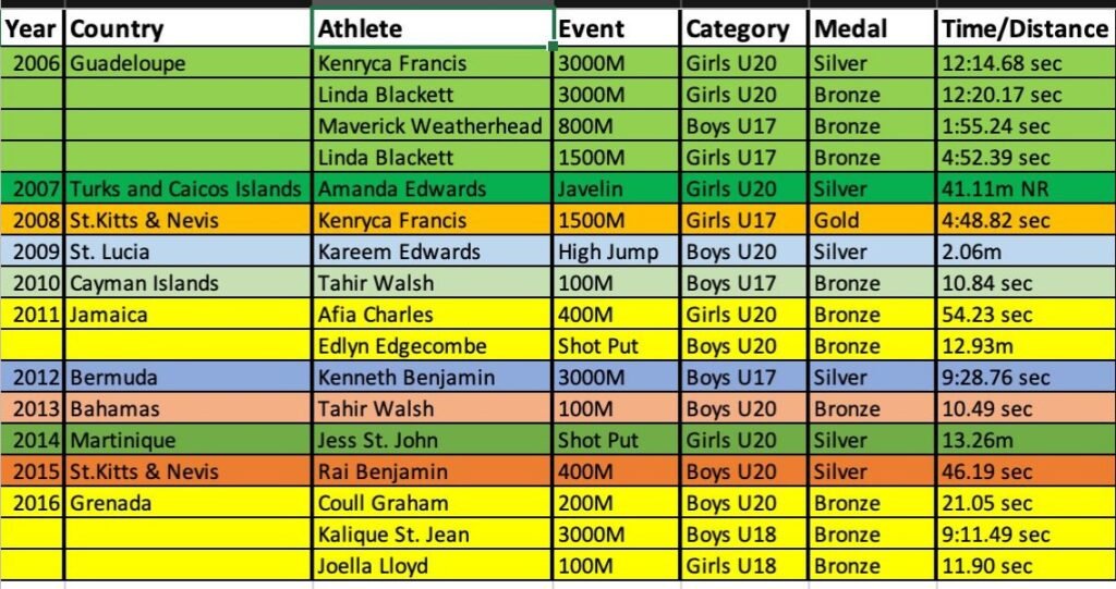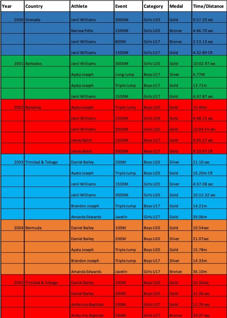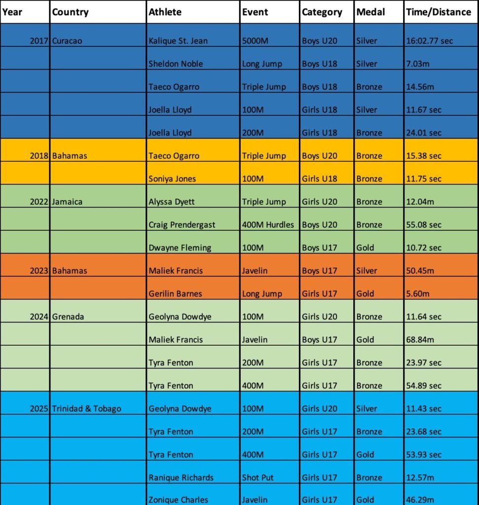Janil’s mastery of the 800m, 1500m, and 3000m set a new standard of consistency for Antigua and Barbuda. Her CARIFTA 14 medal count comprises 12 golds, 1 silver, and 1 bronze. She remains a well-known figure in CARIFTA discussions across the region.