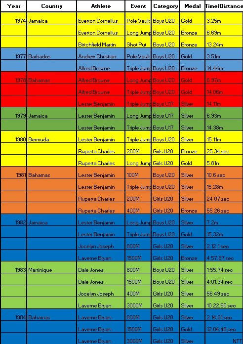 The foundation years tell a clear story. When Bertsfield Martin and Everton Cornelius opened Antigua and Barbuda’s CARIFTA account in 1974, they did so in field events. That pattern would define the country’s early identity. Through the late 1970s and 1980s, success leaned heavily toward jumps and throws, supported by disciplined middle-distance performances.