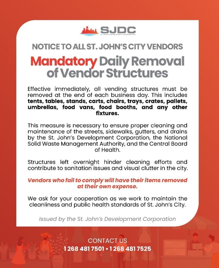 The earliest clear signal of the Minister’s intention to tackle the long-standing challenges of St. John’s came through a deliberately phased and politically sensitive intervention: vending. He outlined a first phase aimed at restoring order to key civic and heritage spaces in the capital. Central to this was a directive prohibiting vending in the immediate surroundings of the V.C. Bird Bust, near the Public Market Complex. Vendors operating in the area were given until April 17 to comply with the new rules issued by the St John’s Development Corporation.