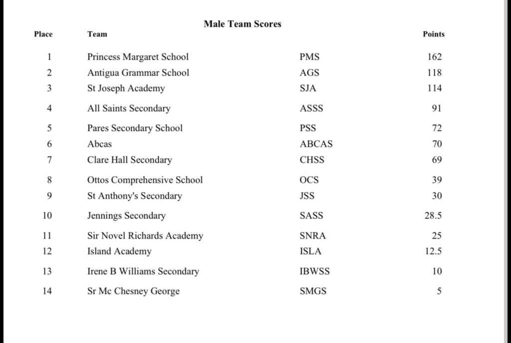 The Boys’ Division also see PMS out front with 162 points, ahead of Antigua Grammar School with 118 and St Joseph’s Academy with 114 points. All Saints Secondary School occupies fourth place with 91 points, followed by Pares Secondary School with 72, ABCAS with 70, and Clare Hall Secondary School with 69 points.