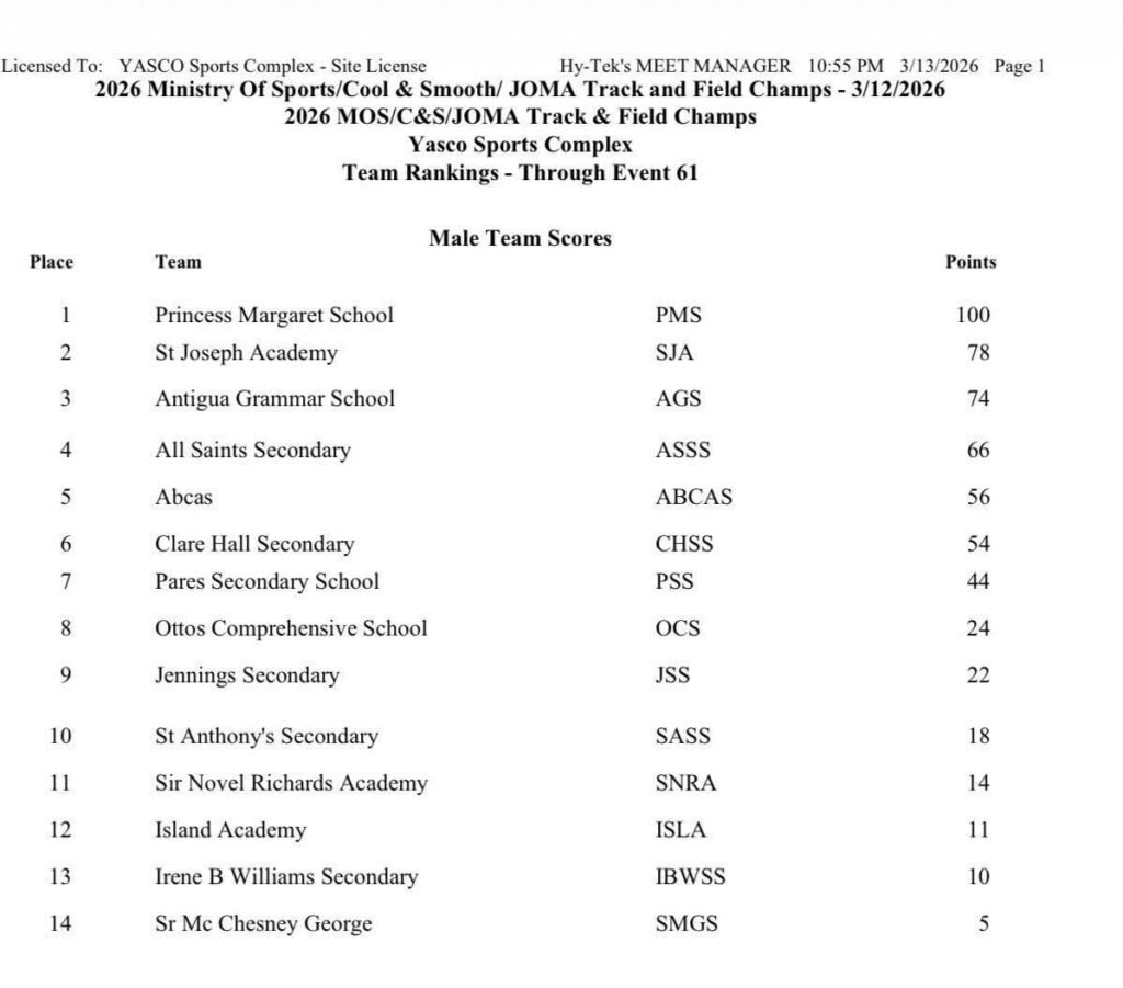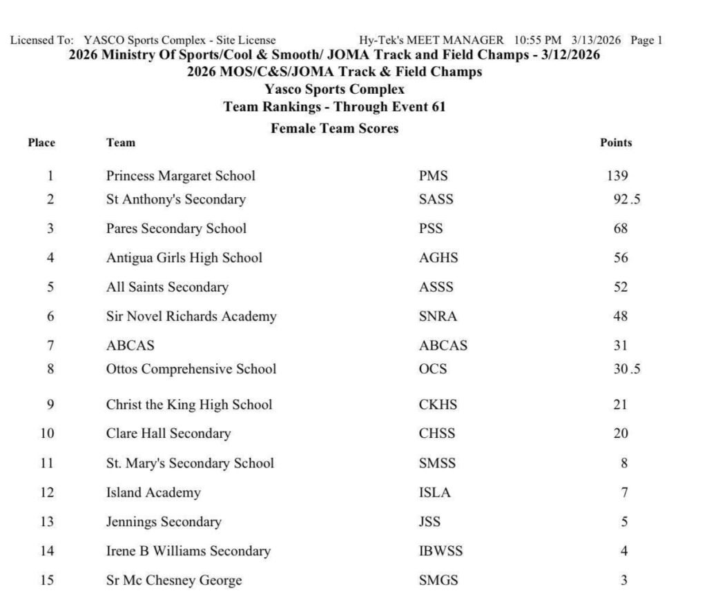 After 61 events, PMS sits comfortably at the top of the Girls’ Division with 139 points, opening a commanding lead over St Anthony’s Secondary School, which has accumulated 92.5 points. Pares Secondary School holds third position with 68 points, while Antigua Girls’ High School remains within reach of the podium on 56 points. All Saints Secondary School follows with 52 points, and Sir Novel Richards Academy currently occupies sixth place with 48 points.