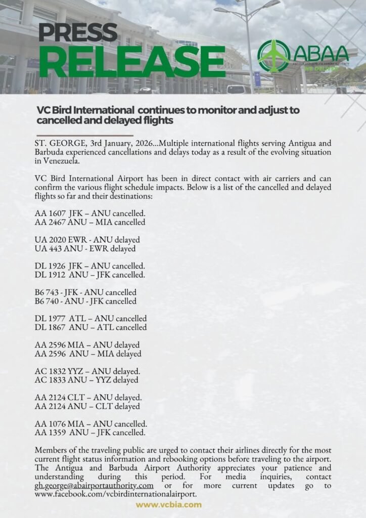 Sunday 4 January 2026 – Antigua and Barbuda’s vital air bridge to the United States was abruptly severed on Saturday after U.S. military action in Venezuela triggered temporary airspace restrictions across parts of the eastern Caribbean, forcing major airlines to cancel and delay flights at the height of the New Year travel rush.