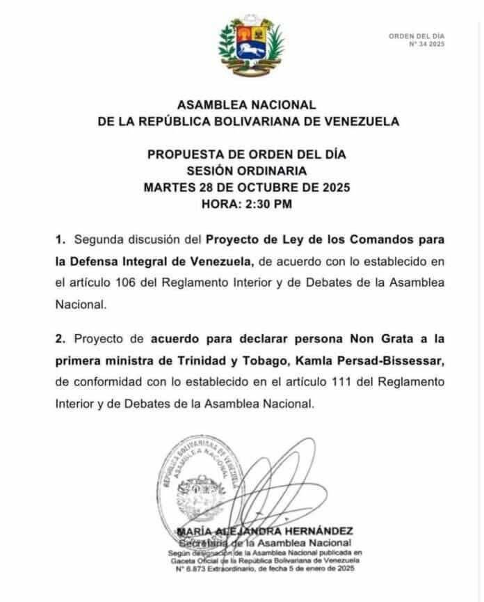 October 28, 2025 – The Caribbean’s cherished identity as a “Zone of Peace” is being tested in real time. Venezuela’s National Assembly has tabled a motion to declare Trinidad and Tobago’s Prime Minister, Kamla Persad-Bissessar, persona non grata, an unprecedented diplomatic strike in CARICOM’s modern history. Once adopted, it would mark the first time a sitting Caribbean head of government is formally condemned by the Venezuelan legislature.